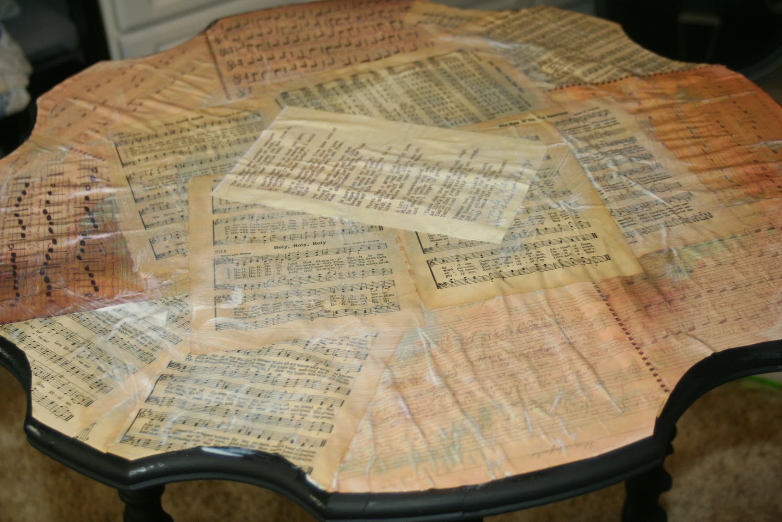 The entire table got a coat of flat black paint. My Grandma Alley wrote music and poems, and I wanted to capture some of her talent in the table top. This was my first Mod Podge project ever, and yes - I am hooked. I copied off Grandma's music, and had an old hymnal that was falling apart, so I used the pages from my favorite hymns to cover the top.